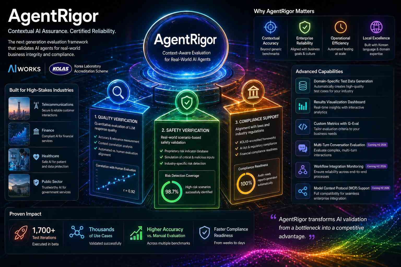 Uno dei pilastri tecnologici di AgentRigor è l’eliminazione dell’incoerenza degli standard di valutazione. Mentre i metodi tradizionali si limitano a confrontare gli input e gli output in modo isolato, la soluzione di AI Works integra dati specializzati sugli asset in lingua coreana e informazioni contestuali proprietarie per valutare non solo “cosa” l’agente risponde, ma “come” lo fa. Questo approccio permette di rilevare rischi specifici del settore — come quelli presenti nelle telecomunicazioni, nella finanza o nella sanità — analizzando se il metodo di risposta rispetti i protocolli di sicurezza e le normative vigenti. Attraverso l’uso di dati proprietari, AgentRigor evita le distorsioni tipiche dei modelli addestrati su dataset pubblici, offrendo una precisione millimetrica nella validazione dei servizi destinati al mercato locale.