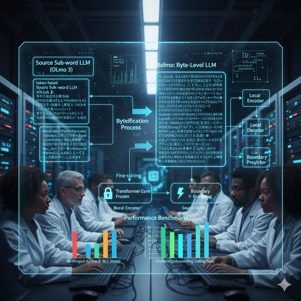 È in questo contesto di ricerca di maggiore robustezza e flessibilità che l’Allen Institute for AI (Ai2) ha introdotto Bolmo, una nuova famiglia di modelli linguistici che opera direttamente a livello di byte. La vera rivoluzione portata da Bolmo non risiede solo nel suo funzionamento privo di token, ma nel metodo innovativo utilizzato per la sua creazione, un processo che Ai2 ha definito “byteificazione”. Fino ad oggi, sviluppare modelli a livello di byte competitivi ha significato affrontare costi proibitivi, partendo da zero con cicli di pre-training estremamente lunghi. Bolmo, invece, dimostra che è possibile convertire, o “byteificare”, modelli di sub-parole pre-esistenti e già molto potenti, come la famiglia OLMo 3 di Ai2, riutilizzando gran parte della loro architettura e delle loro capacità di ragionamento.