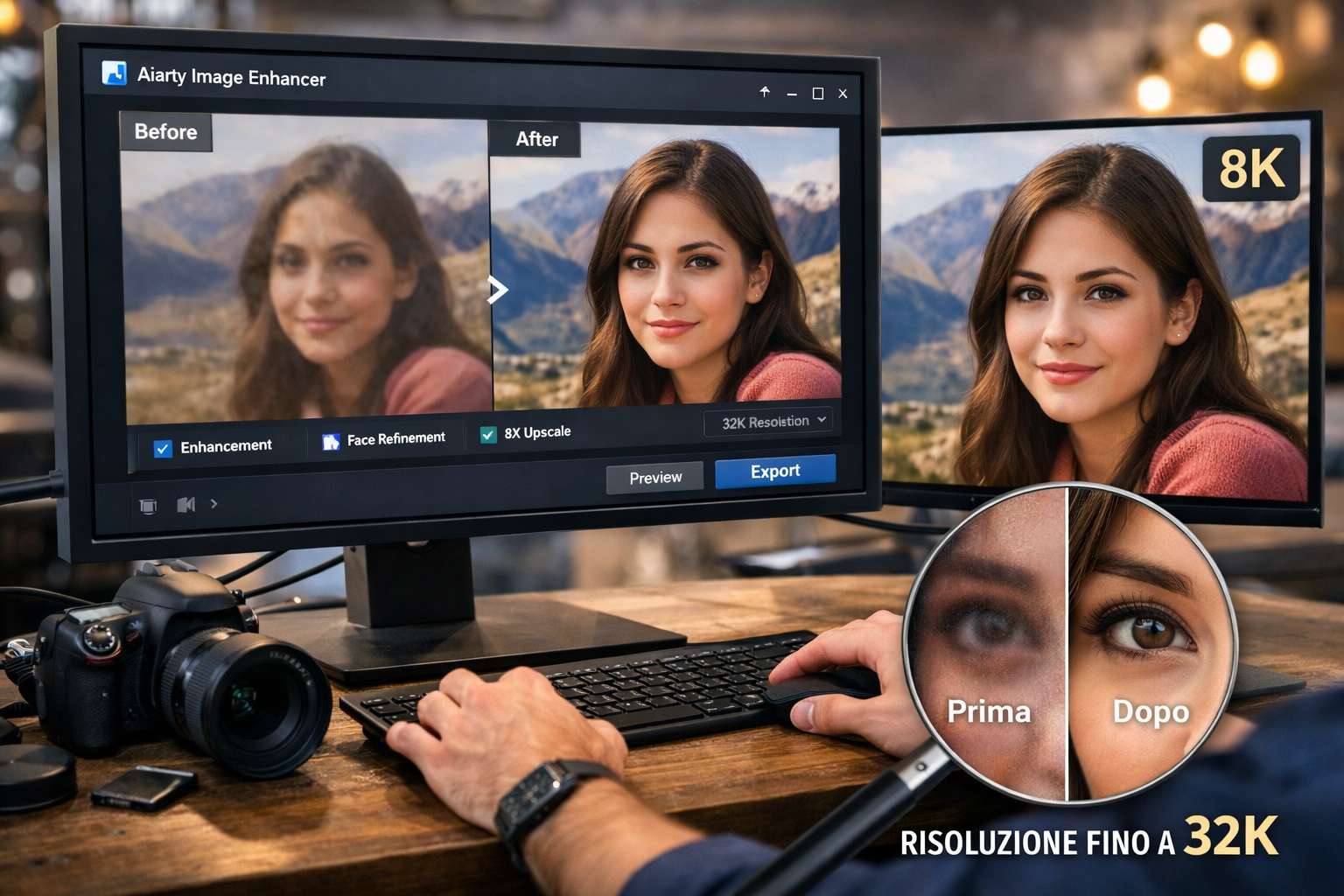 Una delle funzionalità più rilevanti del software è la possibilità di aumentare la risoluzione delle immagini attraverso tecniche di upscaling basate su AI. Il sistema consente di ingrandire una fotografia fino a otto volte rispetto alla dimensione originale, generando una versione più grande e dettagliata dell’immagine. Questo processo permette di portare immagini a bassa risoluzione verso formati molto più elevati, come 4K, 8K e fino alla risoluzione 32K, che rappresenta uno degli standard più avanzati nel campo della visualizzazione digitale.