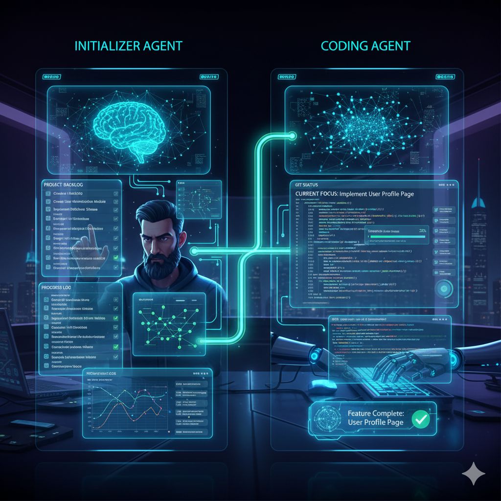 La soluzione proposta non si affida a un singolo modello monolitico, bensì scompone il problema attraverso un approccio a due agenti distinti e collaborativi, incapsulati in un ciclo di lavoro rigoroso e iterativo. Il primo elemento è l’Agente Inizializzatore. Il suo compito è preparare il terreno in modo meticoloso. A partire dalla richiesta iniziale dell’utente, l’Agente Inizializzatore non si lancia subito nello sviluppo, ma stabilisce una fondazione solida: genera una lista completa e dettagliata di tutte le funzionalità richieste, crea un log di progresso per tracciare lo stato di ogni feature e inizializza l’ambiente di lavoro con strumenti di persistenza come Git. L’atto di scrivere e formalizzare la lista delle funzionalità, segnandole inizialmente tutte come incomplete, è cruciale: definisce l’ambito del progetto in modo oggettivo e previene che l’agente consideri il lavoro prematuramente finito.