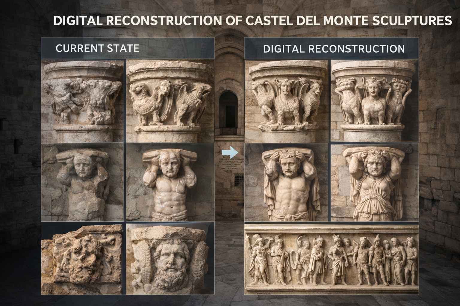 Arriva la ricostruzione digitale delle sculture presenti all’interno di Castel del Monte, uno dei monumenti medievali più studiati e al tempo stesso più enigmatici d’Europa. Il lavoro, sviluppato da Giuseppe Magnini e Vincenzo Quinto, si inserisce in una linea di ricerca che unisce analisi storico-artistica tradizionale e tecnologie digitali avanzate, con l’obiettivo di restituire una possibile configurazione originaria di elementi oggi deteriorati o incompleti.