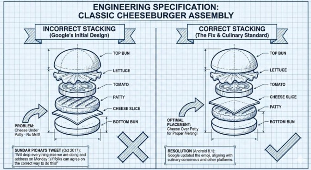 Per comprendere il significato profondo di questa immagine, è necessario fare un salto indietro nel tempo, precisamente all’ottobre del 2017. All’epoca, Google si ritrovò involontariamente al centro di un’accesa, e quasi comica, polemica globale: la sua emoji del cheeseburger per Android era stata disegnata in modo platealmente difettoso. A differenza dell’emoji di Apple e del buon senso culinario, il design di Google posizionava la fetta di formaggio sotto l’hamburger. L’errore, che sembrava banale, innescò un’ondata di scherno e critiche sui social, costringendo il CEO Pichai a intervenire scherzosamente, promettendo: “Lasceremo perdere tutto quello che stiamo facendo e risolveremo questo problema”.