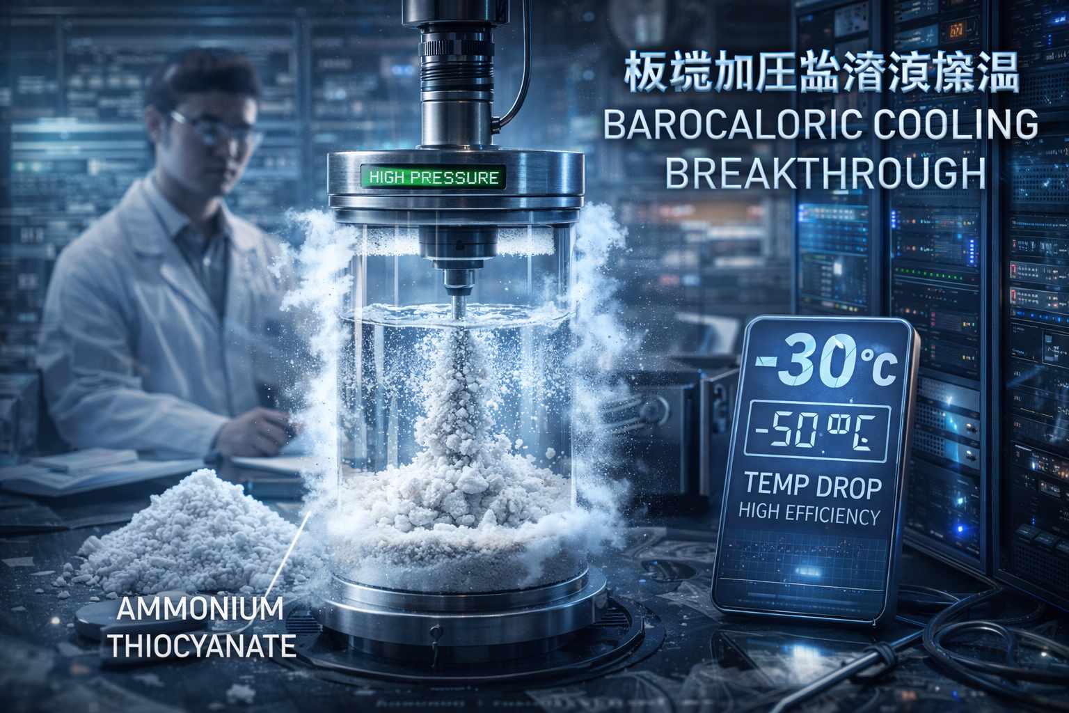 Un team di ricerca della Accademia Cinese delle Scienze ha pubblicato su Nature uno studio che descrive un effetto barocalorico estremo ottenuto attraverso un processo di dissoluzione salina. In termini semplici, i ricercatori hanno dimostrato che sciogliendo il sale di tiocianato di ammonio in acqua fino al punto di saturazione e applicando successivamente una pressione che viene poi rilasciata in modo istantaneo, è possibile ottenere un abbassamento della temperatura fino a 30 gradi in condizioni ambientali normali e fino a 50 gradi in ambienti ad alta temperatura. Si tratta di valori notevoli, soprattutto se confrontati con le prestazioni dei sistemi di raffreddamento oggi in uso.