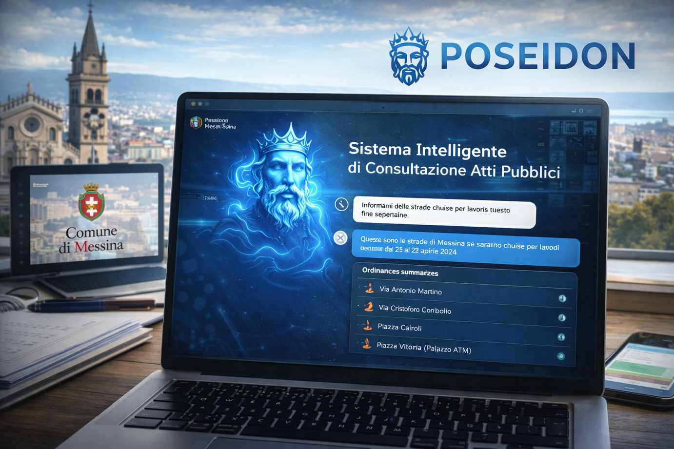 Il progetto Poseidon nasce con una missione precisa: rendere trasparente e immediatamente fruibile la complessa rete di decisioni che regolano la vita quotidiana, con un focus iniziale sulle ordinanze viabili. Ogni anno, il Comune di Messina emana oltre duemila ordinanze che riguardano chiusure stradali, divieti di sosta per lavori o modifiche alla circolazione per eventi. Fino ad oggi, per un cittadino recuperare queste informazioni significava scorrere infiniti elenchi nell’Albo Pretorio o interpretare testi tecnici spesso ostici. Grazie a Poseidon, questa barriera viene abbattuta. Attraverso una piattaforma intuitiva, l’utente può “dialogare” con il database del Comune ponendo domande semplici, come se stesse parlando con un impiegato esperto: si può chiedere se una determinata via sarà chiusa nel weekend o quali sono i divieti attivi in una piazza specifica. L’intelligenza artificiale analizza in tempo reale i documenti ufficiali e fornisce una risposta chiara, sicura e verificata.