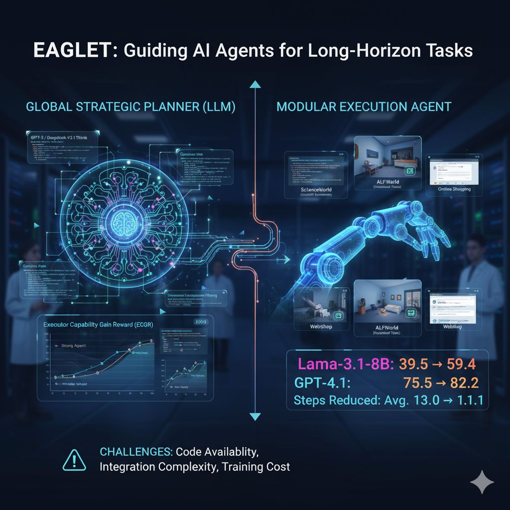 Come far sì che un sistema basato su modelli di linguaggio mantenga la rotta quando un compito si estende su molti passaggi? Le prestazioni tendono a degradare man mano che la sequenza di azioni si allunga, con errori cumulativi, deviazioni e “allucinazioni” pianificatorie che compromettono il risultato. È proprio in questo contesto che emerge EAGLET, un’architettura accademica pensata per migliorare l’efficacia degli agenti IA su compiti a lungo orizzonte—senza ricorrere a enormi dataset etichettati a mano, né a un ripensamento radicale dei modelli esecutori.