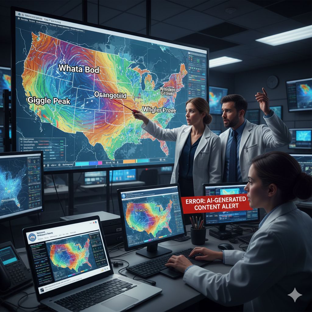 Tuttavia, la realtà si è rivelata più complessa quando, lo scorso fine settimana, il servizio meteorologico statunitense ha condiviso sui suoi canali social una mappa dei venti che mostrava nomi di località completamente inesistenti, come se città fantasma avessero improvvisamente fatto la loro comparsa sulle mappe di previsione. Località come “Whata Bod” o “Orangeotild” sono apparite nei grafici dell’NWS, ma nessuno sulla Terra conosce realmente questi posti. Questo errore, causato dall’uso non adeguatamente supervisionato di strumenti di IA generativa nella composizione grafica della previsione, ha portato l’agenzia a rimuovere rapidamente la mappa e a correggere l’errore, spiegando che l’uso di tali strumenti per i prodotti rivolti al pubblico non è usuale e sottolineando la necessità di maggiore controllo umano nei contenuti rilasciati.