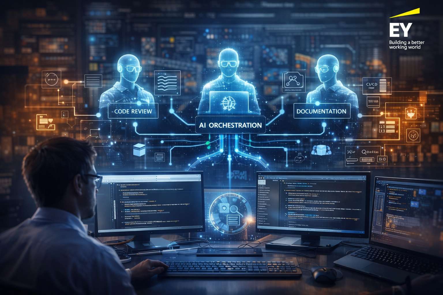 Uno degli aspetti centrali dell’approccio di EY è il concetto di AI agents specializzati. Invece di utilizzare un unico modello generativo per tutte le attività, il sistema prevede diversi agenti progettati per compiti specifici. Alcuni sono dedicati alla generazione e revisione del codice, altri alla scrittura della documentazione tecnica, altri ancora all’analisi dei log o alla gestione delle pipeline di build. Questa suddivisione consente di ottimizzare i modelli e le istruzioni operative per ciascun contesto, migliorando la qualità dei risultati e riducendo il rischio di errori.