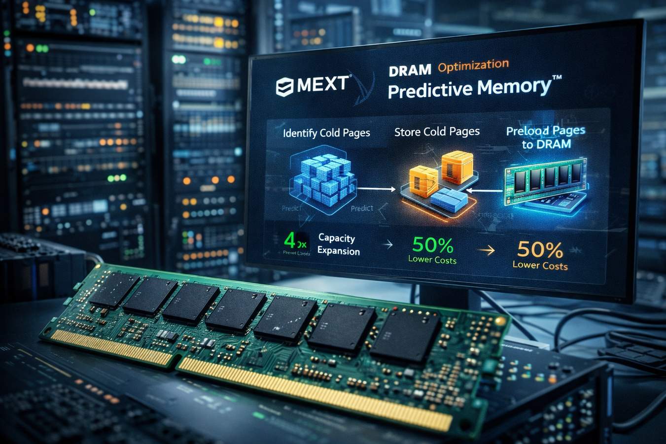 Il funzionamento di Predictive Memory si basa su un’analogia funzionale con i modelli di linguaggio di grandi dimensioni (LLM). Proprio come un LLM predice la parola successiva in una sequenza testuale, il motore di intelligenza artificiale di MEXT analizza i pattern comportamentali dei carichi di lavoro per prevedere quale “pagina” di memoria sarà necessaria nel momento immediatamente successivo. Questo processo si articola in tre fasi operative coordinate: l’identificazione delle pagine di memoria non attive (definite “cold”), il loro spostamento verso unità di archiviazione flash — che presentano costi notevolmente inferiori rispetto alla DRAM — e la successiva riallocazione proattiva nella memoria principale prima che l’applicazione ne faccia richiesta.