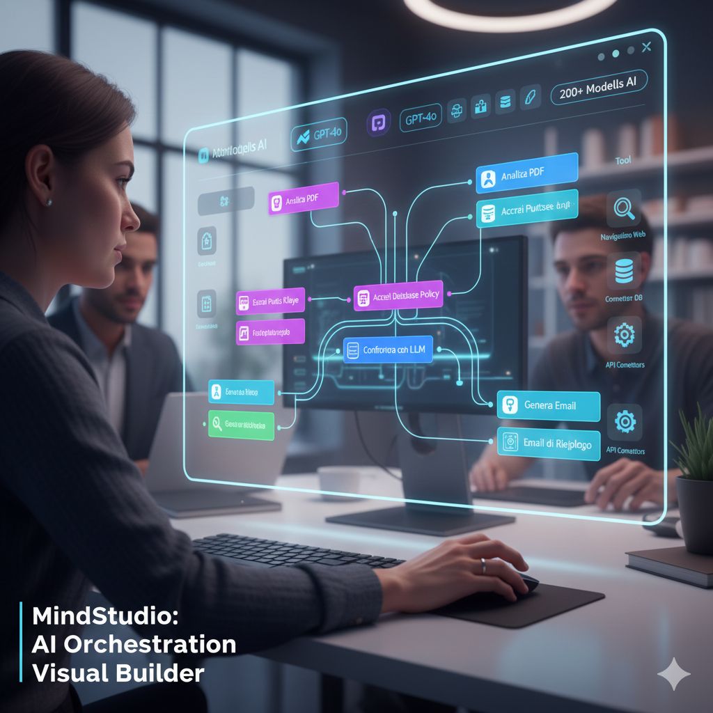 MindStudio non è semplicemente un’interfaccia per interagire con un singolo Modello di Linguaggio di Grande Dimensione (LLM). È una piattaforma di orchestrazione, che significa che gestisce l’interazione tra l’utente, molteplici tool esterni e uno o più LLM in una sequenza logica complessa. Quando l’utente definisce un workflow, ad esempio: “Analizza un documento PDF, estrai i punti chiave, confrontali con le policy aziendali e genera una bozza di email di riepilogo,” MindStudio suddivide questo compito in: