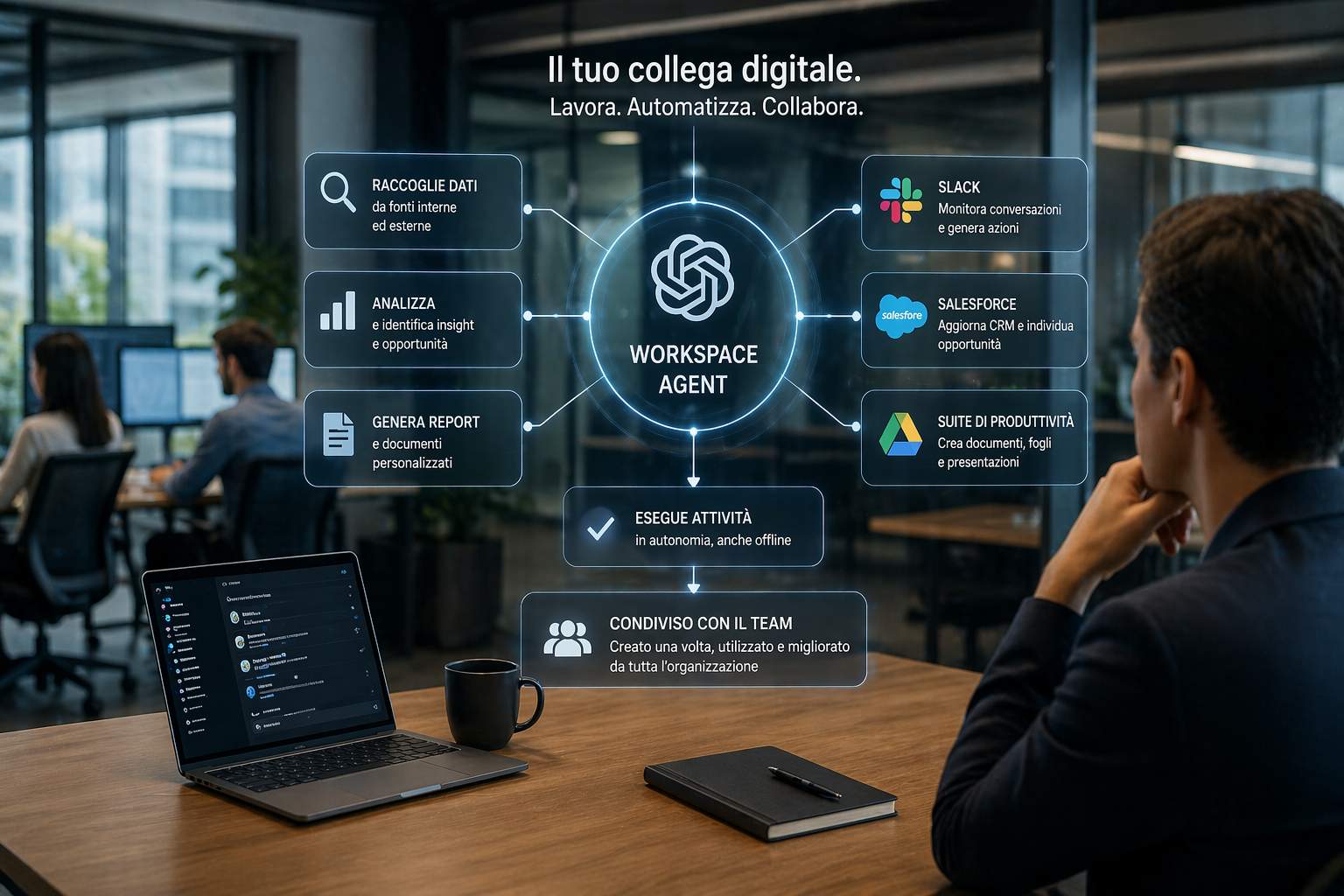 Il vero salto di qualità, però, riguarda l’integrazione con gli strumenti aziendali. I Workspace Agents sono progettati per collegarsi direttamente a piattaforme già utilizzate nelle imprese, come Slack, sistemi CRM come Salesforce e suite di produttività. Questo consente all’AI di operare nel contesto reale del lavoro quotidiano, accedendo ai dati giusti e intervenendo nei processi esistenti senza richiedere infrastrutture completamente nuove.