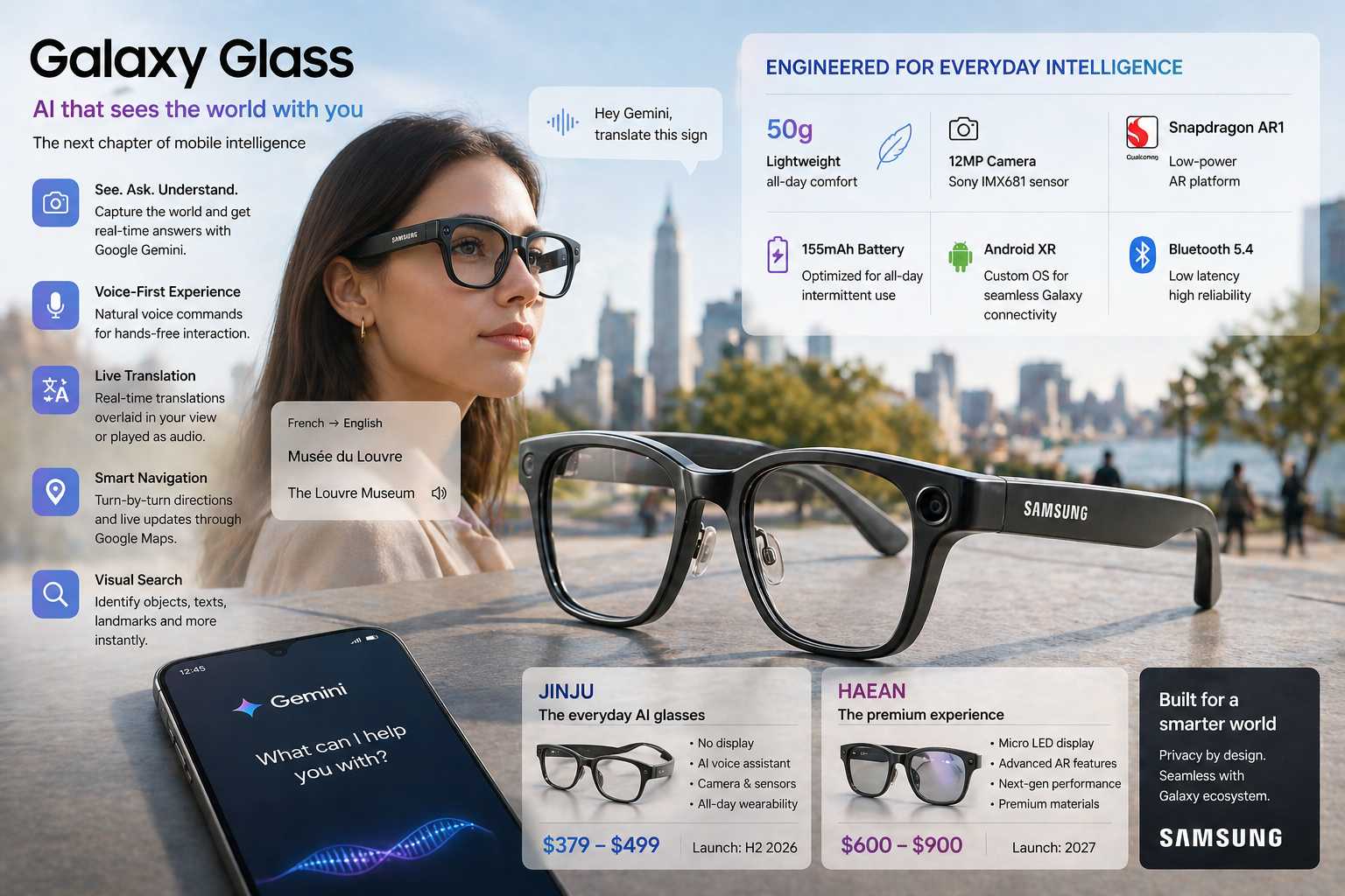 L’imminente debutto dei Galaxy Glass, identificati dal nome in codice Jinju, segna l’ingresso ufficiale di Samsung Electronics nel settore degli occhiali intelligenti focalizzati sull’intelligenza artificiale generativa. La strategia di Samsung per la seconda metà del 2026 si discosta sensibilmente dai visori di realtà mista ingombranti, puntando su un design leggero da 50 grammi che privilegia l’estetica e la portabilità quotidiana. Questa scelta progettuale è supportata da una configurazione hardware ottimizzata per l’elaborazione dei dati ambientali tramite sensori, rinunciando, in questa prima fase, a un display interno per massimizzare l’efficienza energetica e il comfort.