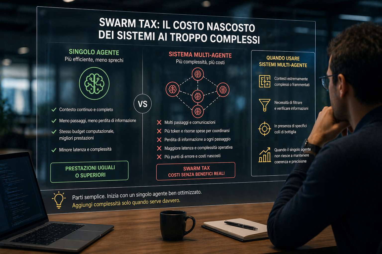 È qui che nasce la cosiddetta “swarm tax”. Le aziende che adottano architetture multi-agente senza un’analisi approfondita rischiano di pagare un costo extra, non sempre giustificato da un reale miglioramento delle prestazioni. Questo costo non è solo economico, ma anche operativo: maggiore latenza, più complessità nel debugging, più punti di errore e una gestione più difficile dell’intero sistema.