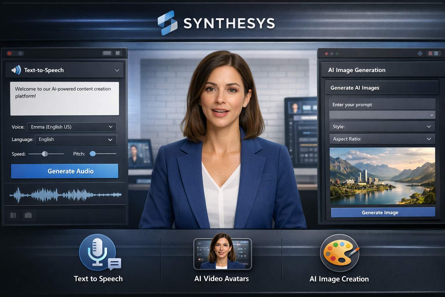 Synthesys è una piattaforma cloud di intelligenza artificiale progettata per generare contenuti audiovisivi automatizzati, combinando strumenti di text-to-speech, video con avatar sintetici e creazione di immagini all’interno di un unico ambiente operativo. L’obiettivo dichiarato è eliminare la necessità di attrezzature di registrazione, attori e workflow complessi, consentendo la produzione rapida di video e voice-over partendo da semplici script testuali. La soluzione si colloca nel segmento dei generatori AI per marketing, e-learning e contenuti aziendali, con un’architettura completamente web-based che non richiede installazioni locali.