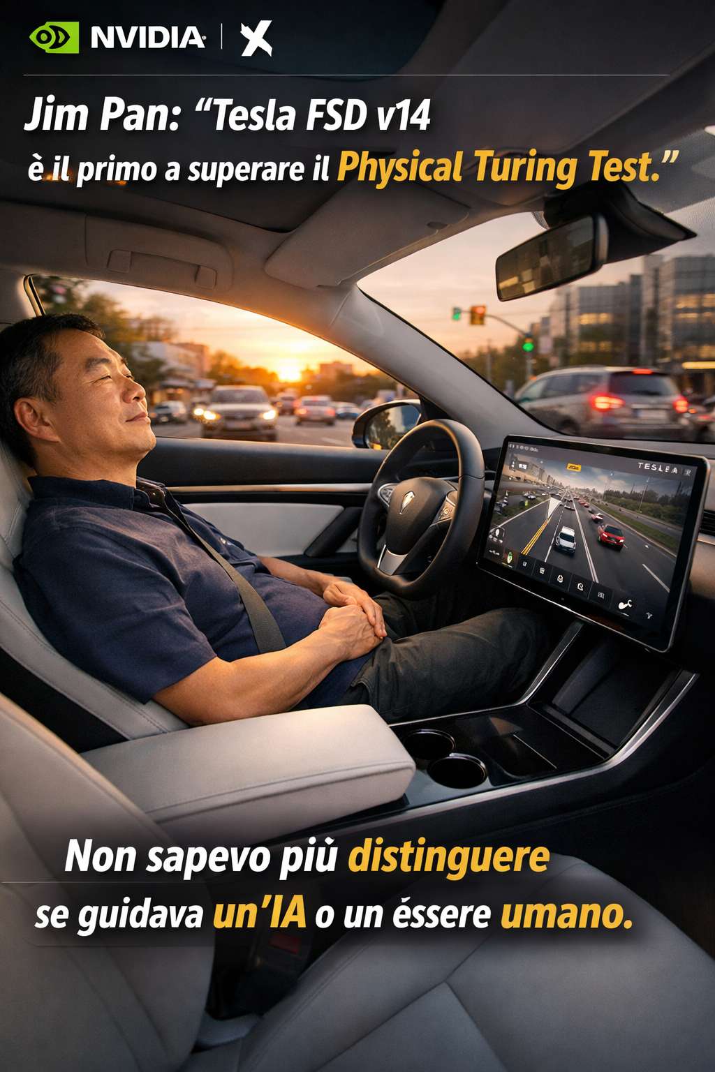 Le recenti dichiarazioni provenienti dal mondo Nvidia hanno riacceso il dibattito su cosa significhi davvero parlare di intelligenza artificiale “umana” quando questa opera nel mondo reale. Jim Pan, responsabile della robotica e dell’intelligenza artificiale fisica di NVIDIA, ha elogiato apertamente il software di guida autonoma di Tesla, definendo FSD (Full Self-Driving) v14 come il primo esempio concreto di un sistema capace di superare quello che lui stesso chiama “Physical Turing Test”. Un’affermazione forte, soprattutto se arriva da uno dei principali ricercatori mondiali nel campo dell’intelligenza artificiale incarnata.