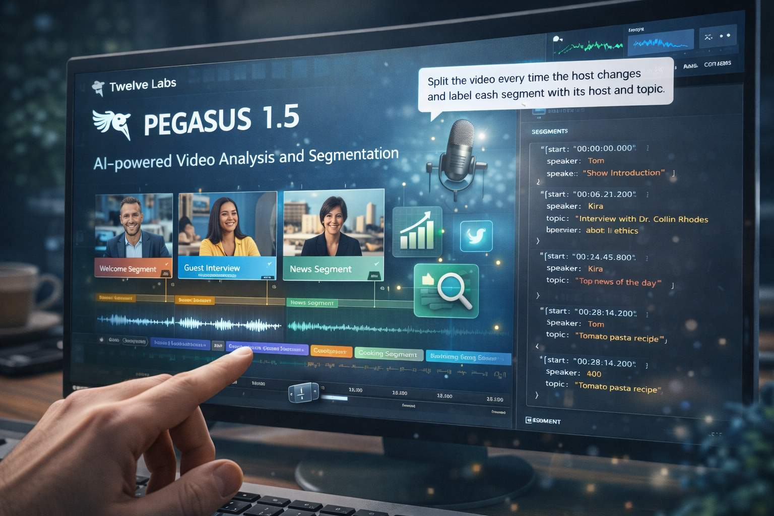Il cambiamento più rilevante riguarda però l’interfaccia tra utente e sistema. Mentre le generazioni precedenti, come Pegasus 1.2, richiedevano interazioni iterative basate su query specifiche, il nuovo modello introduce un approccio dichiarativo, in cui l’utente definisce direttamente la struttura desiderata del video. Un’istruzione come “dividi il video ogni volta che cambia il conduttore e associa a ciascun segmento il nome e l’argomento trattato” viene interpretata dal sistema come un obiettivo progettuale, non come una semplice richiesta di ricerca. L’intelligenza artificiale esegue quindi un’analisi completa del contenuto e restituisce un output già organizzato secondo i criteri richiesti.