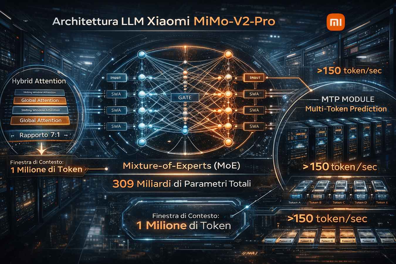 Il cuore tecnologico del MiMo-V2-Pro risiede nella sua raffinata architettura Mixture-of-Experts (MoE), che gestisce un totale di circa 309 miliardi di parametri, di cui solo una frazione, stimata intorno ai 15-20 miliardi, viene attivata per ogni singolo token. L’innovazione più significativa rispetto alla precedente versione “Flash” riguarda il meccanismo di attenzione. Il modello implementa un sistema di Hybrid Attention che alterna strati di Sliding Window Attention (SWA) a strati di Global Attention con un rapporto di 7:1. Questa configurazione permette al modello di mantenere una finestra di contesto estremamente vasta, fino a un milione di token, riducendo drasticamente il carico sulla memoria KV-cache. Mentre la Sliding Window si occupa di elaborare le relazioni locali con una finestra dinamica, lo strato globale agisce come un integratore di memoria a lungo termine, permettendo al sistema di non perdere il filo logico anche in documenti di proporzioni enciclopediche.